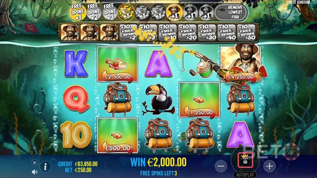 Zunächst erscheinen diese extremen Fische während der Freispiele. Anschließend müssen sie vom Angler eingesammelt werden. Beispielsweise verwandelt ein 250x Multiplikator einen 10 Euro Einsatz in 2.500 Euro. Folglich sind lebensverändernde Gewinne möglich. Außerdem können mehrere extreme Fische gleichzeitig erscheinen.